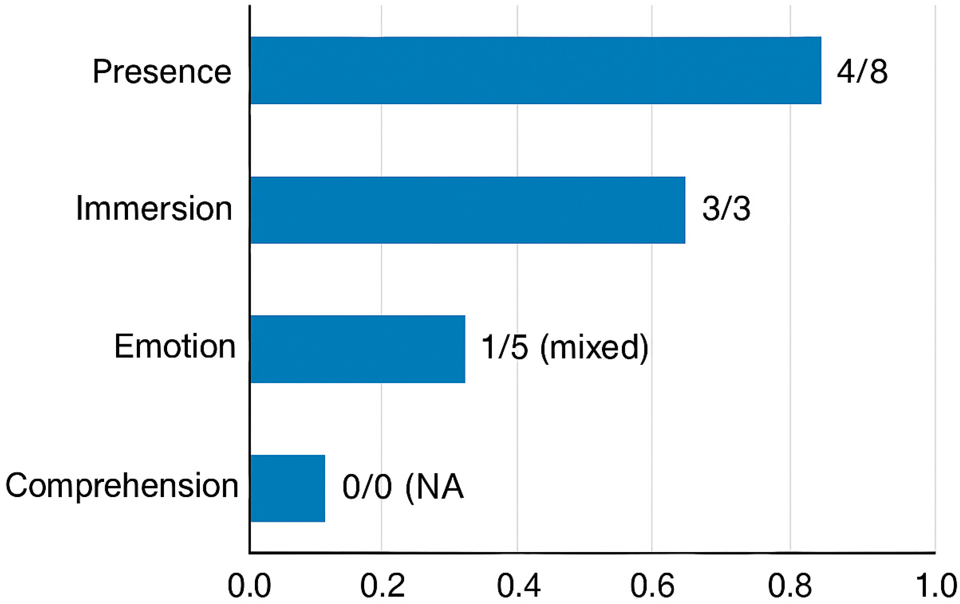 - Outcomes → (immersion OR presence OR engagement OR embodiment OR emotion* OR “user experience” OR ux OR comprehension OR transportation OR absorption OR “story world absorption”)
