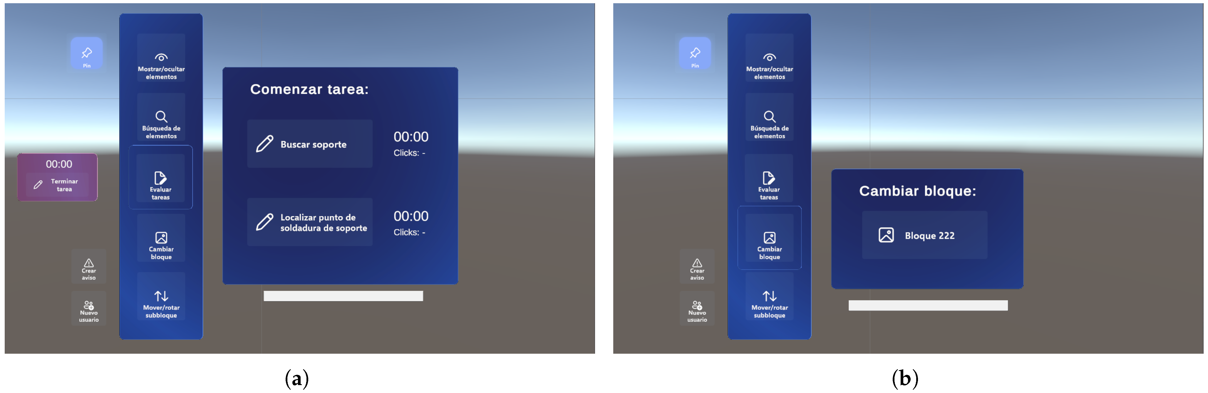 Overview of the application: (a) panel to administer the task manager; (b) panel for changing between vessel’s blocks.