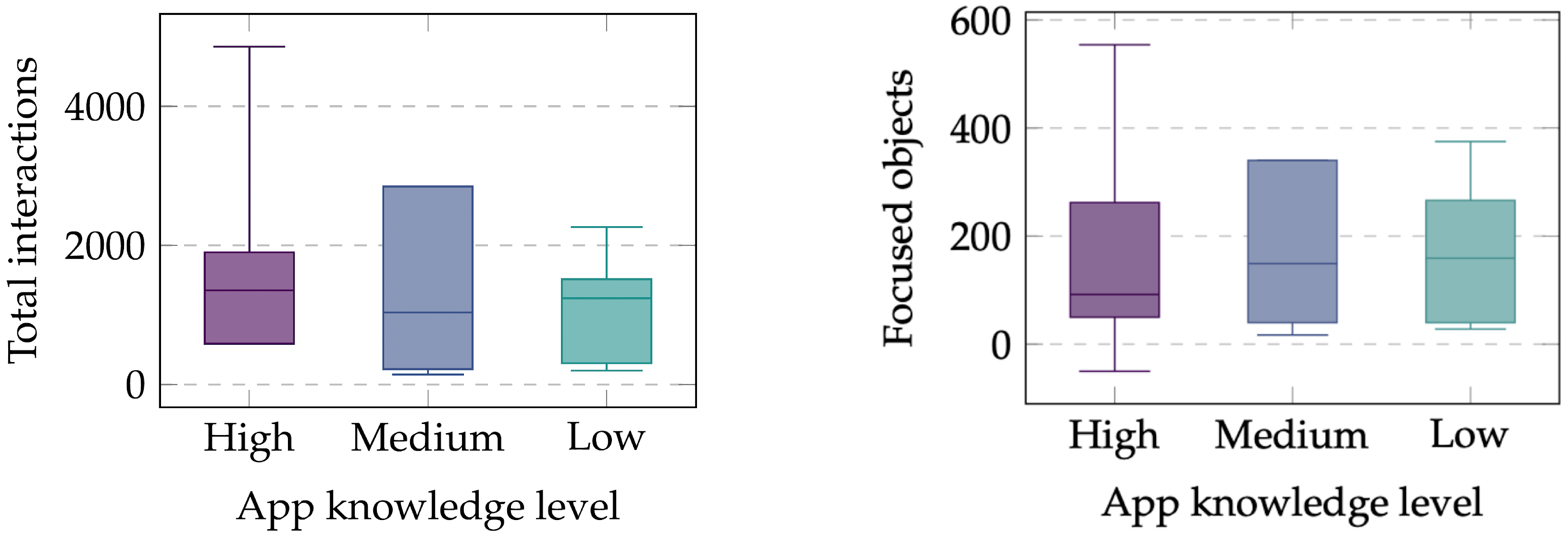 Number of total interactions (left) and focused objects (right) grouped by user app level of knowledge, which demonstrate that prior experience with the application influences interaction type and frequency.