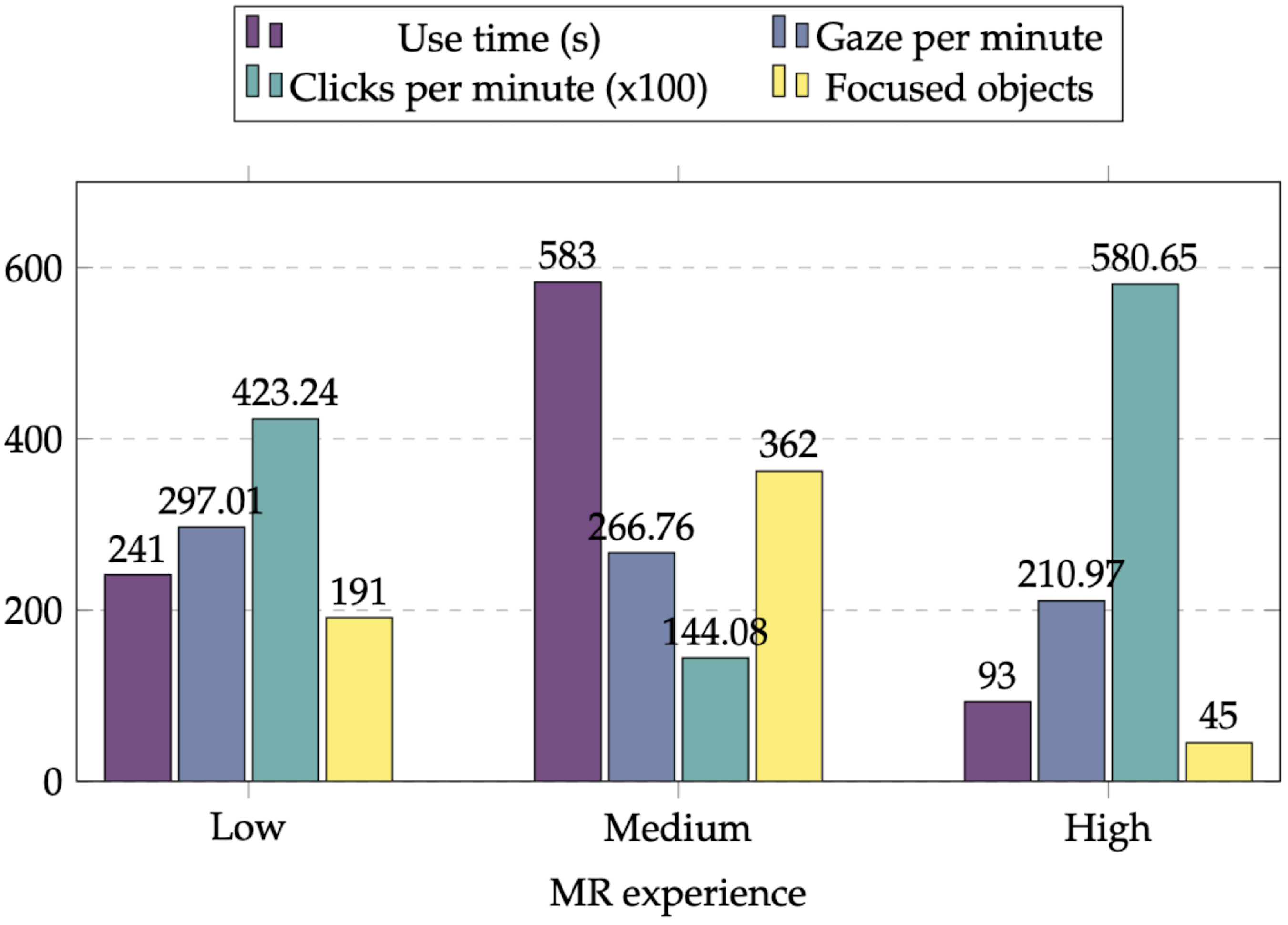 Results of the experiment which show the influence of prior MR experience on several interaction metrics like use time, gaze per minute, clicks per minute and focused objects.
