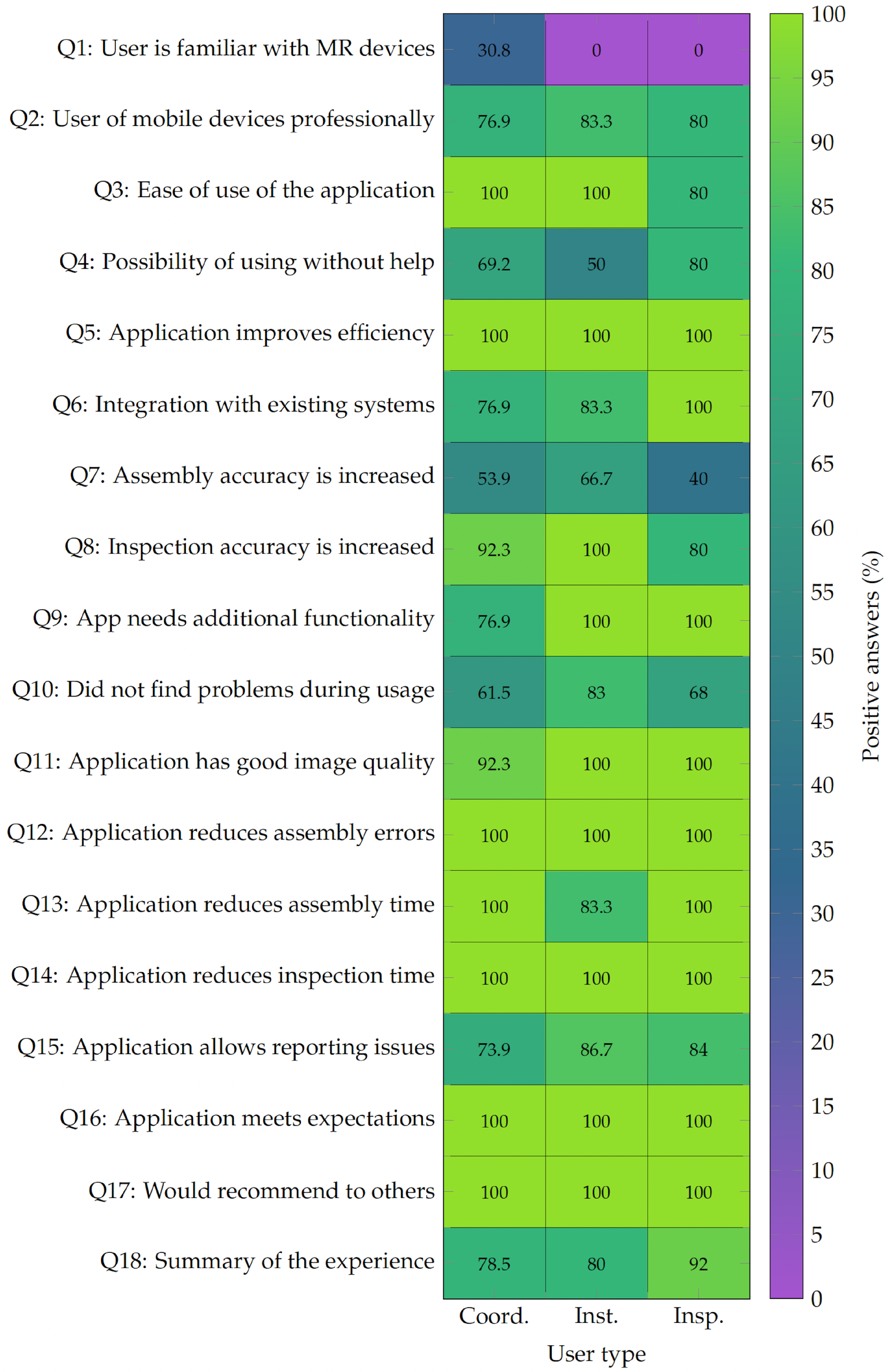 Percentage of positive answers per user type for each question in the survey.