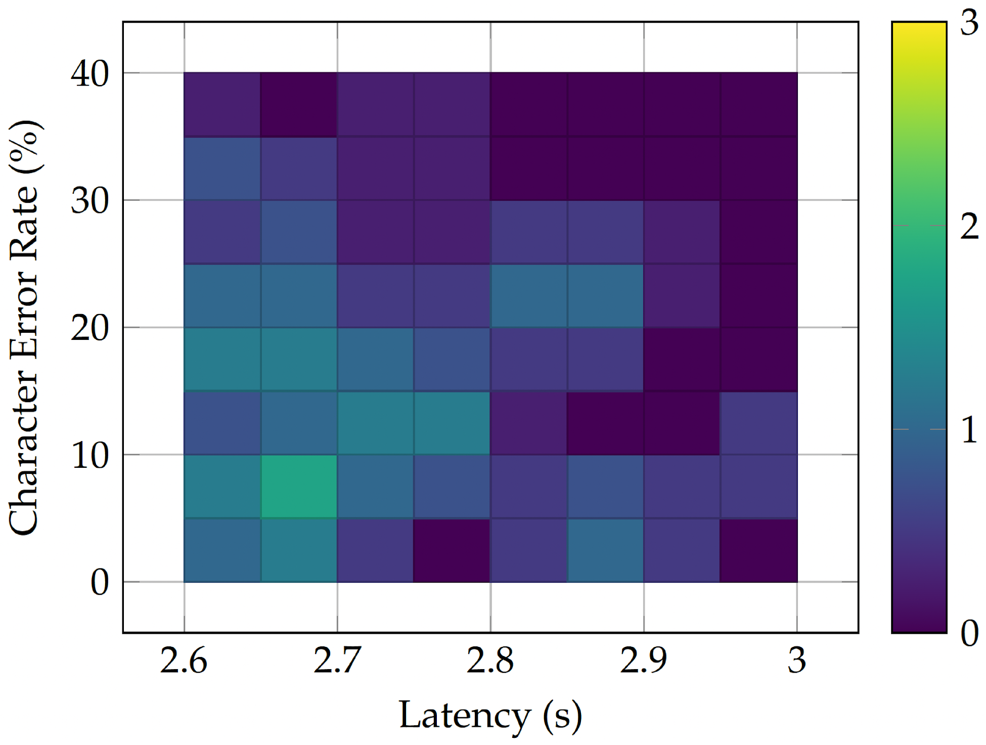 Heatmap which shows the distribution of latency and character error rate during the ASR system tests inside the shipyard.