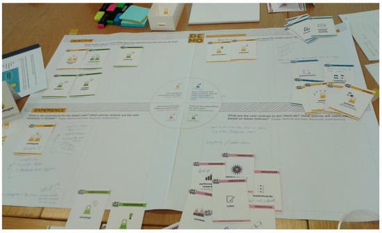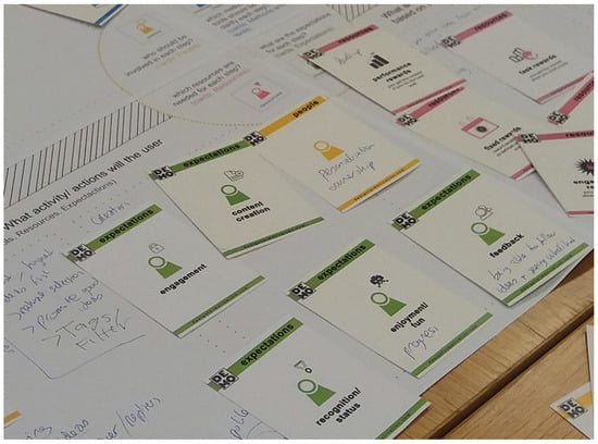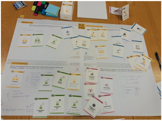 The use of artefacts during the design process, such as the cards and the board in this case, is a common practice to scaffold ideation and concept development in the early phases of design [,]. First, the use of artefacts created a game-like activity that triggered creativity among multidisciplinary teams. The game-like activity was the strongest factor in the participants’ experience with DEMO that maintained their interest and focus on the design task. In particular, it was found that when working with a complex topic, such as motivation, a game-like activity provides structure for concept building. Usefulness was also considered an important factor for utilising the tool, and this was also reflected in the workshops’ episodic activities.