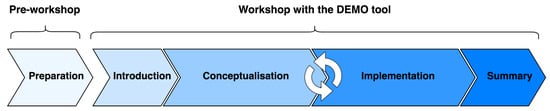 The design process consists of pre-workshop preparation and the workshop (Figure 2). The preparation for the workshop refers to the selection of participants and their familiarisation with the DEMO tool, the processes of the workshop and the design task. It is not mandatory for participants to have any experience in workshop participation or in using design tools. Pilot sessions can also be arranged to familiarise participants with the tool.
