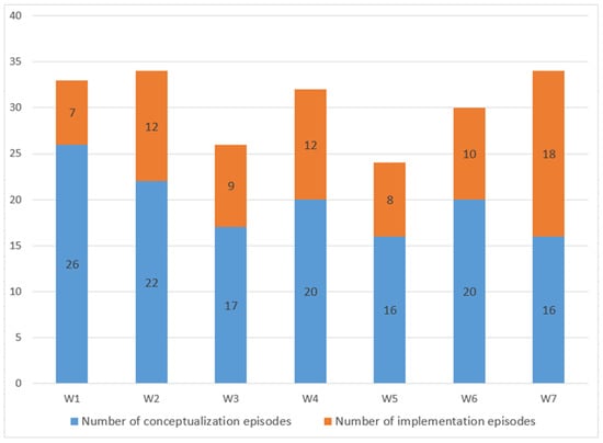 The groups worked intensively during the workshops on the design task for approximately two hours to create a motivation plan for innovation platforms. To better examine the group activities, the design process was segmented into episodes that were qualified as ‘framing-moving-reflection’ cycles []. The problem finding (Framing-F), idea generation (Moving-M) and idea evaluation (Reflecting-R) episodes were mapped for the workshops, with fluctuating numbers of episodes across time. Also, the episodic activities were represented under two conditions, with cards and without cards. For the purpose of this study, each workshop was coded as W1–W7, including the pilot workshop that fulfilled the aim and standards of the study. This analysis produced a total of 213 episodes for the 14 h of data (Figure 6). The lengths of the episodes varied from a total of 1 min to 11 min. The workshop activities were divided into conceptualisation and implementation episodes. On average, 20 episodes of conceptualisation and 10 episodes of implementation activities represented a typical workshop.