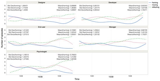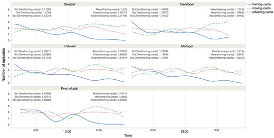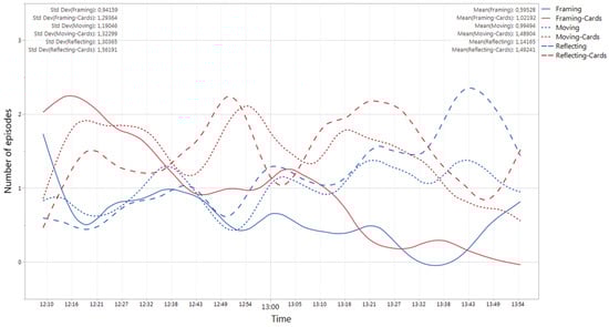 Then, the workshops were examined based on the use of DEMO. Figure 7 presents the overall episodic activities of the workshops. The mean value for the episodic activity (number of episodes) was mapped for both conditions on the timeline: with and without cards. The time corresponds to the actual time of the workshops that took place from 12.00 PM–14.00 PM. Some interesting patterns emerged. The episodic activity was quite balanced in the workshops. The problem finding (framing) and the idea generation (moving) activities presented higher mean values when the team used cards. The evaluation of the suggested ideas (reflecting) had higher values in general for the same condition, but not in all workshops separately. Problem finding (with cards) always began more intensively in the first phase of conceptualisation and faded out in the late phase. The idea generation and evaluation (with cards) usually began later in the design process, with fluctuating values. It was observed that problem finding presents a complementary effect between the two conditions, where the activity with cards seemed to increase when the activity without cards decreases.