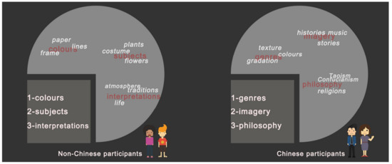 From the analyses of Phase 1, we observed a notable difference in the way non-Chinese and Chinese participants discussed paintings. Figure 1 represents the main structures and elements of the two groups from their group presentations. For the first stage, the findings were focused on the primary impression of Chinese traditional painting. The colours of Chinese painting were the first element to be noticed by non-Chinese interviewees; the colours of the paintings were also seen as a basis to affirm the identity of Chinese painting. For instance, FP5:
