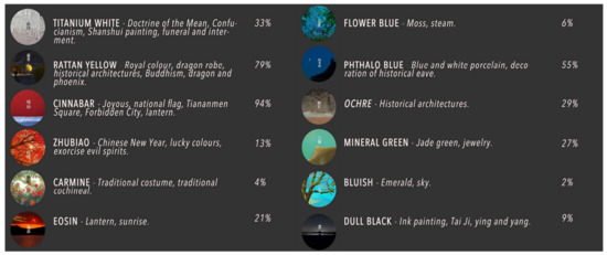 The interpretation of colours in different cultures is much more complex and difficult than a study with the purpose of naming colours in different cultures [30]. We used a questionnaire to determine the main colours that are related mostly to Chinese traditional culture [31,32]. Furthermore, we also used semi-structured interviews as a primary method to explore a potentially deeper meaning behind the participants’ choices of colours [33]. Based on the study by Yu on colours in traditional Chinese paintings, we used 12 traditional Chinese painting colours to gain an understanding of them, and also the imagery behind the colours themselves [29].