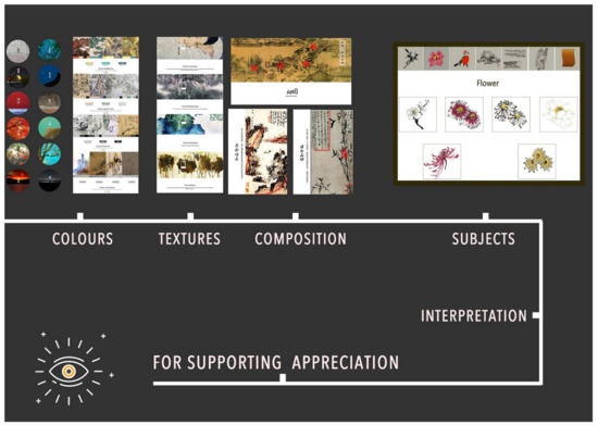 Simultaneously, based on participants’ experience and engagement of the application we designed, participants complemented more dimensions that were for supporting the elemental archives. Colour–subject–interpretation as an appreciating method showed just one approach to appreciation, but was not limited to only this approach. Therefore, combining our findings, we classified these three elements (colour, composition, and texture) for the archive. First, the interpretation of Chinese traditional colours was diversified, and the origin of Chinese traditional colours differed from the interpretation of Western contemporary colours. Therefore, the integrated and visual interpretation of Chinese colours could provide an opportunity to support the appreciation of Chinese painting. Secondly, extraction of the composition of Chinese painting has its own theory, which is similar to the perspective effect and inverse perspective effect [35]. Understanding the composition of Chinese painting would support its appreciation dramatically. Thirdly, the understanding of textures in Chinese painting offers an audience an in-depth method of appreciation [35]. Overall, the understanding of the subjects may be strengthened and may become more concrete due to these elements. Therefore, the subjects could be seen and used as a further elemental source that interprets the audiences’ understanding of the subtle aesthetics in Chinese painting (Figure 6).