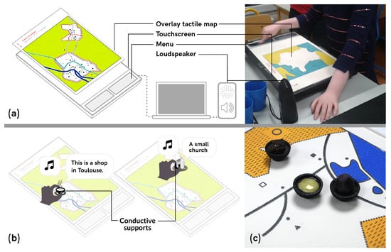 - Brule, E.; Bailly, G.; Brock, A.; Valentin, F.; Denis, G.; Jouffrais, C. MapSense: Multi-Sensory Interactive Maps for Children Living with Visual Impairments. In Proceedings of the 2016 CHI Conference on Human Factors in Computing Systems, San Jose, CA, USA, 7–12 May 2016; ACM: New York, NY, USA, 2016; pp. 445–457. [Google Scholar] [CrossRef]