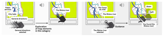 The design of the menu was based on the design of keys or legends for regular tactile maps. Legends were structured around the different types of geographical information. In general, when discovering a new tactile map, visually impaired people first read the legends []. Similarly, in the prototype, students can go through the first menu, and then read the content within each category (second menu). The guiding option allows pupils to find a point of interest by themselves and thus to take full advantage of the interactive system.