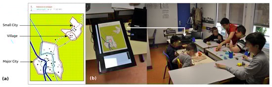 October 2015. The teacher gave two lessons on the same subject (e.g., types of human habitats): one was a “hands-on” lesson, a class trip for the discovery of the regional capital, the second was the group discovery of the interactive map of Toulouse. This did not uncover design insights, but familiarized the children with this type of pedagogical scenario.