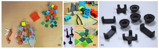 (a) all tangibles designed for the study; (b) examples of tangibles: various buildings, flags and green spaces; (c) conductive bowls (top right), and conductive supports for the other tangibles.