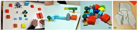 (a) non-interactive models that children reconstructed using tangibles only. From left to right, a major city (C3–C1), a village (C4–C5), and a small city (C1); (b) laser cut wood representation of the shape of each city, which can be used with the tangibles.