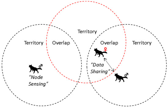 Adjacent and overlapping territories due to gender differences. By observing the behaviors of various territorial animals, wildlife wearing a type ♀ sensor near a sink node exhibits a high probability for encountering adjacent wildlife that wears a type ♂ sensor. While encountering another individual, there is a high probability that both ♀ and ♂ sensor nodes will be within the communication radius. By exploiting such territorial structure and gender differences, we propose that the observation range of wildlife wearing sensors can be expanded.