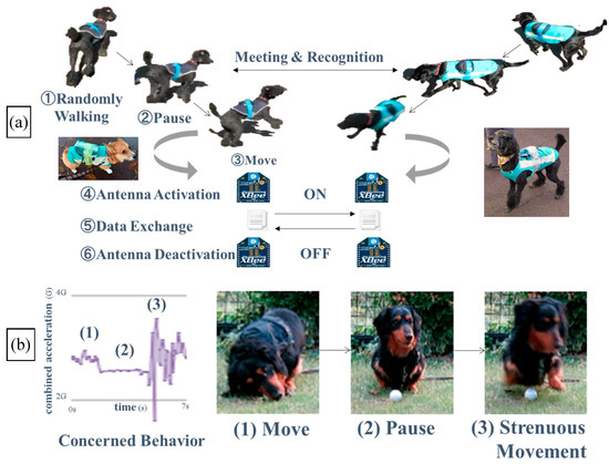 (a) Animal-to-animal data sharing process (①–⑥); (b) reaction state of dogs to peripheral stimuli ((1)–(3)).