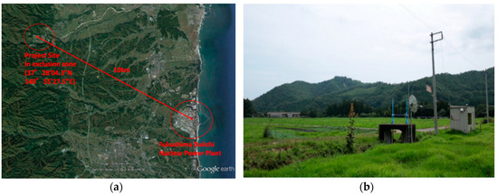 (a) Project site in the Fukushima exclusion zone (37°28′4.3″ N, 140°55′27.5″ E; 10 km from Fukushima Daiichi Nuclear Power Plant) and (b) sink node station.
