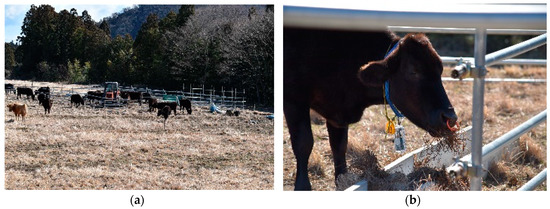 For our experiments, we used two Japanese Black cattle (Kuroge Washu), as shown in Figure 5b. Cow A was approximately eight years old, weighing approximately 400 kg and standing approximately at 150 cm. Cow B was approximately three years old, weighing approximately 100 kg and standing approximately at 100 cm. As the sensor weight was within the tolerable limit (i.e., no greater than 2% of the animal’s body weight) [11], we assumed that the sensor weight would not impact the behavior of the cows.