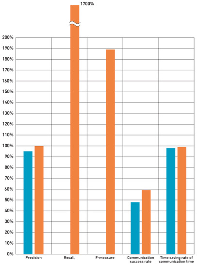 We observed a significant number of communication attempts in the form of visually assumable encounters or active contact. In consideration of the synchronization errors between the communication devices and video data, we allowed for a window of three seconds. We also calculated the precision, recall, and communication success rate of our data-sharing system. Regarding precision, we used the number of encounters or contact attempts as the numerator and the number of communication attempts as the denominator. For recall, we used the same numerator; however, the denominator was the specific number of encounters or contacts.