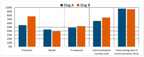 Problems that cannot be computed due to the visually unconfirmable reactions are affected by the design of the algorithm. The protocol of this system is designed based on a dog’s response as observed by the human eye, as depicted in Figure 2b. In other words, if there is insufficient response as observed by a human or if there is little response, an appropriate evaluation cannot be performed. However, the numerical value of communication attempts as measured by the device was greater than or equal to 1. Even in the case of Cow A, which demonstrated poor visible reaction, it is possible that the device itself measured the reaction. Obviously, false positives are possible; however, such cases can be considered hints while developing new algorithms if they are considered to be the behavior of animals.