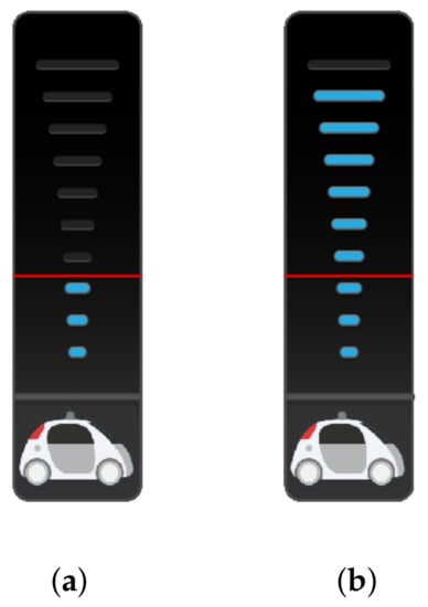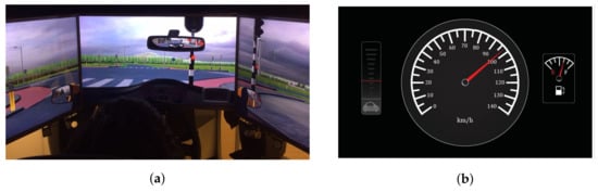 The experiment took place in a fixed-based driving simulator, as shown in Figure 1a. The GUI is shown in Figure 1b, and was designed using Adobe Illustrator (Adobe Systems, San Francisco, CA, USA) and Processing 3.3 (Processing Foundation, Boston, MA, USA). It acted as a platform that facilitates information exchange between the user and the system. A simple design was used, avoiding as much unnecessary information and showing as few components as possible, while maintaining its essence: showing the speedometer, the fuel gauge and the system’s confidence level.