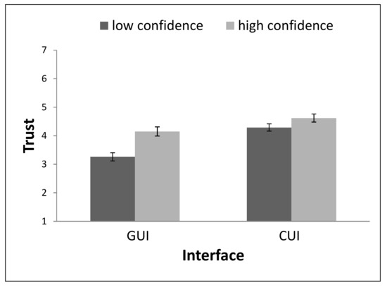 The CUI was trusted more than the GUI, with F(1, 55) = 8.81, p = 0.004, p2 = 0.14. In addition, the interface with high confidence was trusted more than the interface with low confidence, with F(1, 55) = 11.56, p = 0.001, p2 = 0.17. These effects are visualized in Figure 3.