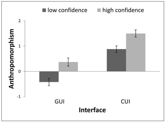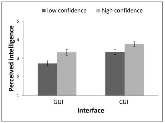 The CUI was perceived as more intelligent than the GUI, with F(1, 55) = 6.60, p = 0.013, p2 = 0.11. In addition, the interface with high confidence was perceived as more intelligent than the interface with low confidence, with F(1, 55) = 13.25, p = 0.001, p2 = 0.19. These effects are visualized in Figure 4.