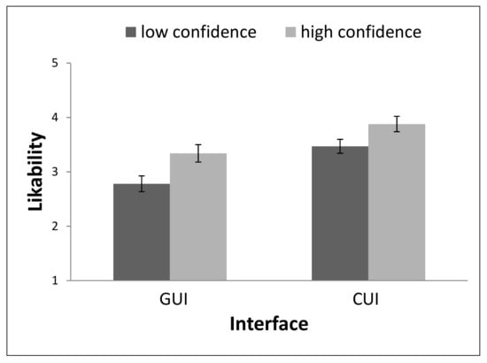 The CUI scored higher on likability than the GUI, with F(1, 55) = 9.76, p = 0.003, p2 = 0.15. In addition, the interface with high confidence scored higher on likability than the interface with low confidence, with F(1, 55) = 14.73, p < 0.001, p2 = 0.21. These effects are visualized in Figure 6.