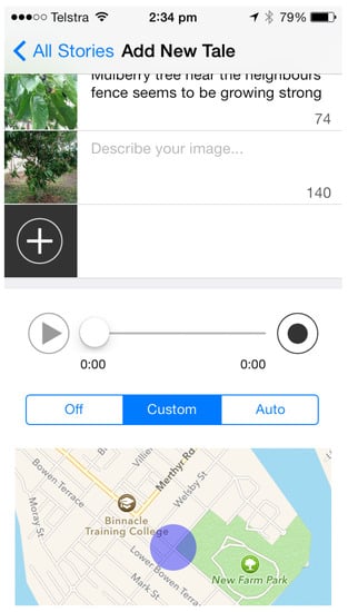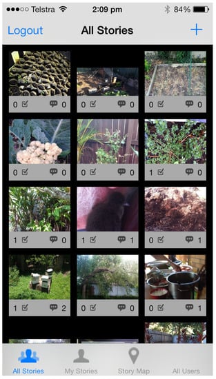 The design rationale of QuickTales as a prototype application to share stories, is a variation of sharing images as part of the aforementioned system I8DAT [,]. The purpose of this was to allow for different types of interaction—a story can be about a gardening experience, a response to another story, a journal entry, a reflection on how the garden has changed, and so forth. The open approach to accommodating various types of stories was based on the insights from our previous studies on different types of urban agriculture in Brisbane, Australia—a city farm, a permaculture organisation, and people growing food at their residence—which led to the development of a set of design patterns []. As a context of this paper and the related studies, Brisbane is Australia’s third largest city, with over two million residents, and the local municipal government provides resources and information about existing community gardens, and their creation (https://www.brisbane.qld.gov.au/environment-waste/be-clean-green-brisbane/community-groups/community-gardens-city-farms).