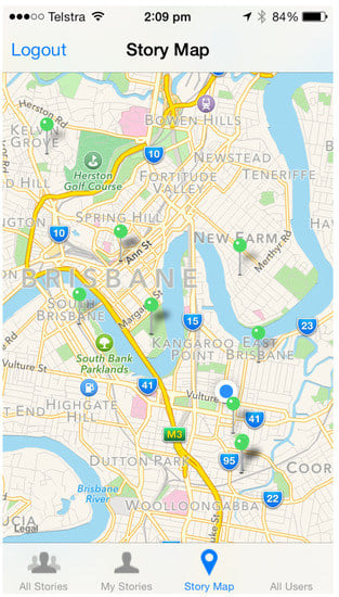 - Klaebe, H.G.; Foth, M.; Burgess, J.E.; Bilandzic, M. Digital Storytelling and History Lines: Community Engagement in a Master-Planned Development. In Proceedings of the 13th International Conference on Virtual Systems and Multimedia (VSMM’07), Brisbane, Australia, 23–26 September 2007; Australasian Cooperative Research Centre for Interaction Design Pty, Limited: Brisbane, Australia, 2007. [Google Scholar]