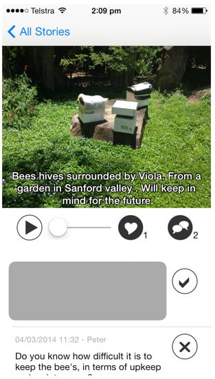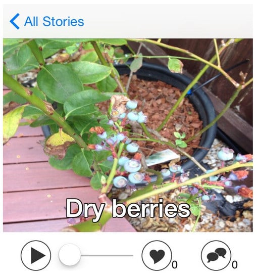 The recorded audio component of a story was not required, and consequently only two participants created a recording as part of their story. For those who did not record, there were multiple reasons related to familiarity of the media type (P2), and consideration for who the audience might be (P1). It is interesting to explore why people prefer different multimedia types. During the interview P1 explained in detail the story of when he first got the blueberry plant, moving it to different locations on his veranda for more or less sun, shifting it to a larger pot as he thought it was root-bound setting up an irrigation system to help automate his gardening process, and his thoughts on why the plant was unwell. The reservation to record audio was not that he was unable to provide detail for his story, but rather the recording and sharing of his voice, which he considered more personal. I inquired whether a speech-to-text service would be preferable and he expressed two reservations—the quantity of text would still be difficult to edit, and the way he talks is different to the way he writes. P1 would prefer to story sync to his desktop computer, and provide a detailed description to accompany the story, which would be feasible given cloud storage, and the flexibility of the development framework.