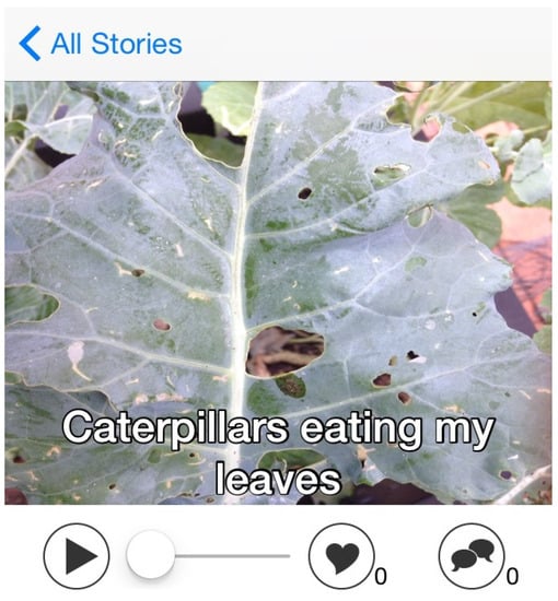Storytelling as an approach seeks to empower individuals to create stories about their own experiences [], and has been explored previously within HCI literature [,]. Storytelling also presents authors with a creative challenge, and offers them the ability to reflect on these experiences []. Furthermore, storytelling offers different insights into the way people engage with the city, as a means of capturing information about local conditions that would otherwise be missed by official reports and documents [,,]. General purpose mobile digital storytelling platforms have been developed and researched, such as StoryKit [], and Storyteller []. These platforms tend to serve several different purposes, often in the educational space, but do not respond to specific needs and characteristics of urban agriculture and related communities.