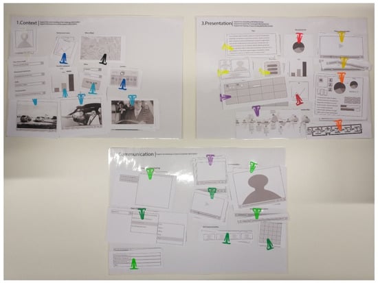 The first part of the toolkit consists of cards of low-fidelity paper illustrations of components (see Figure 2) derived from the guidelines of previous work. These cards both serve as stimuli for discussion (i.e., what the users say and do) about the design and application of the system in context, the acceptance of the technologies used, the system’s architecture and interactivity, and lay the foundations as a tool for prototyping (what the users make). Similar tools presented by Sanders’ “make” tools [] are commonly used by practitioners, including the “interface toolkit” by Frog design. Components include the following: car passengers (1 or many); behavioral tendencies; relation (friends, family, and intimate other); emotion, skills; physical and temporal context; where (map); when (time and date); weather (sunny, rainy, etc.);temperature; noise (very loud, not loud at all, etc.) system context; percentage of use of in-vehicle information systems (IVIS); video/audio/text/emoticons/gifs; charts/pies; snapshots infographic; storyboard; and customer journey.