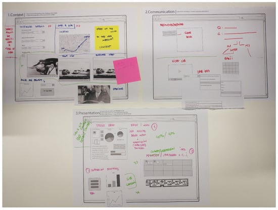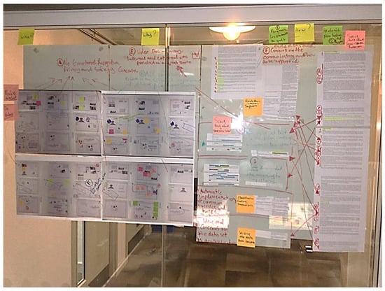 The prototypes created are the means that the participants use to express their multi-layered needs and the experiences they want to have when interacting with similar systems. Therefore, we can extract more in-depth information from the explanation of the created prototypes and even relate them to the previous data. Consequently, we go beyond the participants’ meanings and the themes that are derived from our analysis and suggest a pragmatic interpretation of the UX Goals of the UX Designers based on context mapping techniques which include the illustrations of the artifacts. Affinity diagrams [] and context mapping techniques [] are both techniques that analyze rich qualitative data. They both use coding of participants’ quotes or notes, and they both try to identify patterns or clusters of behavior or activity. They both use big spaces as tables or walls to map, structure, and cluster the previously collected data and extract meaning. We achieved a holistic understanding using these techniques (see Figure 4) to triangulate the video and audio transcripts (what participants say and do) with the paper prototypes (what participants make) in the second part of the analysis.