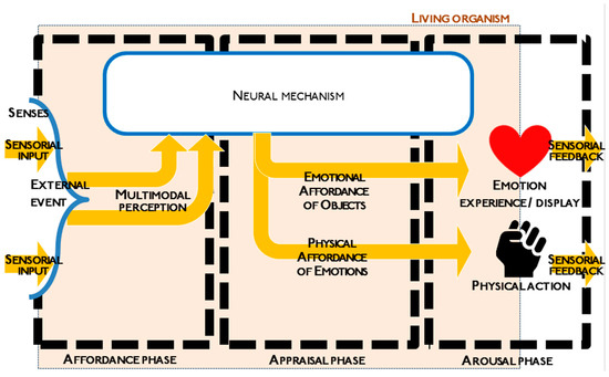 In Figure 1, the boundaries of the human or of the living organism are marked in the pink box. Out of it, we can observe the external events and the feedback to those events. The diagram is divided in three phases, namely Affordance, Appraisal and Arousal.