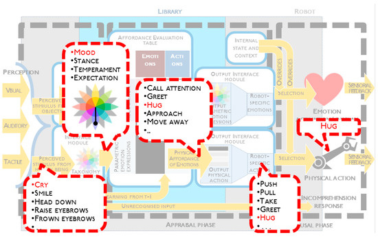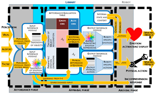 A fundamental aspect of our model is the dynamical nature of libraries which must combine departing emotions with concluding related actions. A combination of parametric emotion recognition with their connection with the value of the object inside a taxonomy of recognised objects provides a dyadic affordance appraisal mechanism: first, the output performance module is able to connect variable and dynamic emotional states inside a holistic framework in which the answer is also emotionally-valued; second, the motor tasks can be calculated according to possible aims.