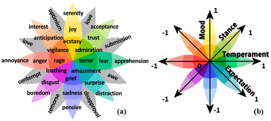 In case of human expressions, the process is slightly more complicated, as it involves the use of an emotional model to parameterise the emotional content. For this purpose, we use Plutchik’s Wheel of Emotions [22], shown in Figure 3a. Plutchik’s model is particularly convenient because it features emotions that are specular: anger is the opposite of fear; disgust is the opposite of trust, and so on. In a previous research [59], each of these emotions pair was referenced by an axis. By using 4 axes (one for each pair of leaves of Plutchik’s Wheel, as in Figure 3b), the emotion can be parameterised. The four axis are called Mood, Stance, Temperament and Expectation, coherently with [59].