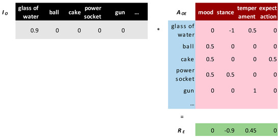 where is the row vector consisting in the input of the 4 components of Plutchik’s parametric model; is a matrix 4 × m consisting in the mapping; and is the output, a row array of the m output action class memberships.