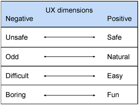 In addition, more elaborated and structured UX studies have to be conducted in this area of HRI research where specific UX goals are identified and then repeatedly assessed [3,5,10]. Highlighting the importance of evaluating the quality of the human–robot interaction is of major concern for a user-centered perspective of social robots in HRI. Many evaluation methods and techniques have been developed resulting in evaluations of different aspects including acceptance, usability, UX, learnability, safety, trust, and credibility. While some of the aspects are covered in depth, others are only briefly touched upon in HRI research [1,66]. Lindblom and Andreasson [6] stressed that there is a need for more theoretical as well as methodological knowledge about methods and techniques that are appropriate for evaluating UX in HRI, and there is a significant need for conducting valid usability and UX studies in order to exploit UX to its full effect and to improve positive UX of socially interactive robots.