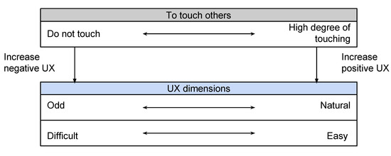 Touching brings positive physiological and biochemical effects, such as decreased levels of the stress hormone cortisol, increased levels of oxytocin, which is linked to increased well-being and anti-stress effects, and decreased heart rate (e.g., [42,43]). Touch has also been shown to affect behavior and attitude, e.g., a brief touch on the arm has shown to positively affect the receiver’s attitude towards the person they have interacted with (e.g., [44,45,46]). For example, students who had been briefly touched on their wrist displayed not only improved attitudes toward the instructor and the lecture, but also an increased motivation to study [47].