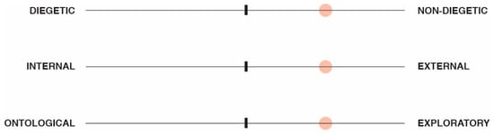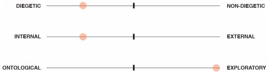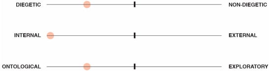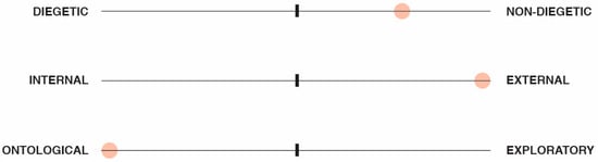 The internal vs. external spectrum (see Figure 1) from Ryan’s framework captures the interactor’s narrative perspective in the story. While the diegetic vs. non-diegetic spectrum involves the embodiment of the interactor distinguished by whether the interactor can physically situate him/herself within the story, the internal vs. external spectrum involves a mental identification of the interactor with a narrative perspective. Ryan defines an internal interaction as one in which “users project themselves as members of the virtual world by identifying with an avatar, who can be shown from either a first-person or a third-person perspective” [16] (p. 108), such as playing the role of a race car driver. In an internal interaction, the interactor becomes an actor or a witness of the events, thus focalizing and interpreting the events in the story from a first-person perspective. An example of an internal mode would be the interactor playing the role of a protagonist in the story to intervene in events, or following the story to focalize and become a witness of events.