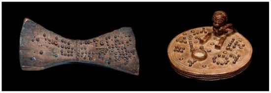 Lukasa board loaned by the Royal Museum for Central Africa (Tervuren, Belgium) for the Mapping Place exhibition (left) and by Brygg Ullmer (right).