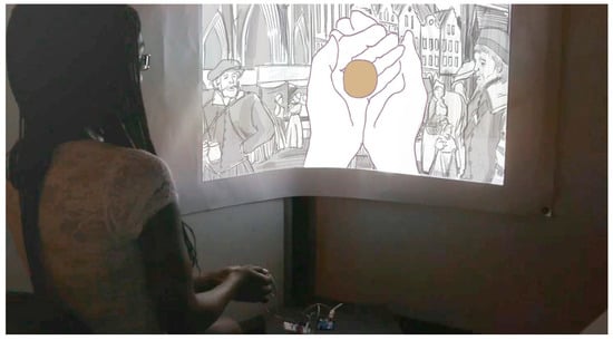 Other researchers focus on the human body as shaping embodied engagement in the world, thus proposing integration of computer systems with our physical experiences [25]. The turn to the human body has inspired how the tangible system has become a resource for human action, in which meaning is created [26,27]. This view has been called the “expressive-movement-centered view” [2]. This literature proposes utilizing the sensory richness of the forms integrated with the interactive system to support the interactor’s meaning-making. An example of a tangible interface that allows expressive movement in a narrative is the Nintendo Wiimote game console device [28]. The device can be held in one’s palm and allows the interactor to make bodily gestures such as shaking, pointing, and waving using one’s arms in order to participate in the game. For example, when playing virtual golf, the Wii console provides sensory feedback that evokes thoughts and imagination, as if one were engulfed in the golf field as a golf player. An example of a sensory experience provided in a museum is the installation of the Lunch Counter Simulation at the Center for Civil and Human Rights in Atlanta [29]. The installation physically re-enacts the sit-in by providing a countertop, four bar stools, and headphones where visitors can sit and listen. Visitors hear the voices of people yelling and pounding on the table, and feel the vibration through the bar stools, thus, sensing the brutality and tension of the scene almost as though they were present during the actual event. Although the multi-sensory experience evokes thoughts about a poignant historic event, visitors have less interactivity and bodily engagement compared to those offered by non-museum projects.