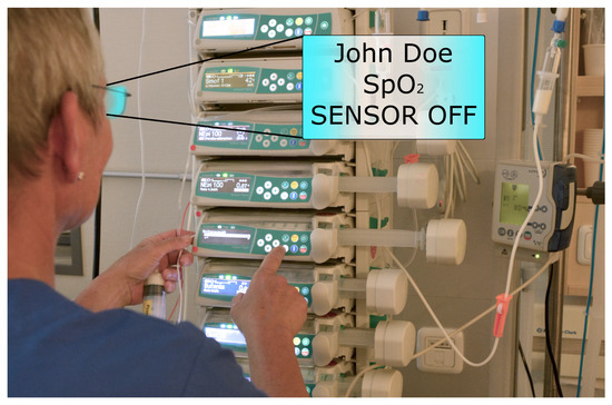 We want to describe this in a future scenario: Jane is a nurse on a surgical ICU. In today’s shift, she is responsible for three patients. While she is changing the medication for her first patient, an alarm for a second patient (John Doe) occurs on her WAS (see Figure 1). The system shows her that alarm is caused by a displaced sensor. Since she knows that this patient is in stable condition, she can silence this alarm for a specific time to finish her task. Afterwards, she walks to her second patient to adjust the sensor and acknowledge the alarm.
