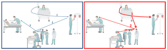 - If the second nurse does not react within 60 s, the alarm will be forwarded to the remaining nurses (see Figure 3 left).