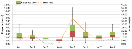 Figure 6 shows the average reaction times and error rates of the participants for each pattern and set. The Shapiro–Wilk test revealed a normal distribution of the data (). The fastest response times were measured for Set 4, which has a median of 1.19 s with a low dispersion. The response time of Set 3 was slightly but significantly worse (Wilcoxon signed-rank: ) with a median of 1.59 s but with a similar dispersion. Generally, the reaction times of Set 3 and Set 4 showed significant differences in comparison with all other sets ().