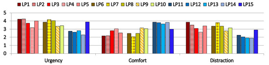 The perceptibility of diversity of urgencies was rated best for Sets 3 and 4 (median 5.0). The remaining sets got an average rating of 3.0 and 4.0, except Set 5 with an average rating of 3.0.