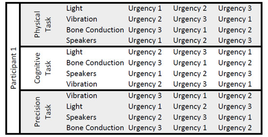 During each task, all conditions were evaluated. Therefore, every participant performed each task and experienced three alarm levels per condition: critical, uncritical and technical alarms. The order of the conditions, alarm levels, and tasks was counter-balanced randomized. A possible setup for one participant is visualized in Figure 18.