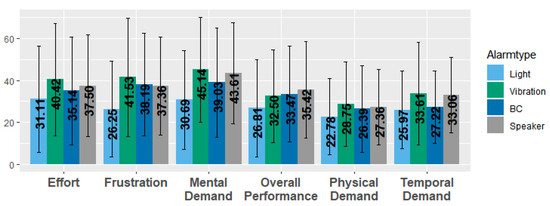 Perceived workload: The analysis of the Raw-TLX showed that there are overall high scores, which means a high workload. However, there is also a high standard derivation for each factor (see Figure 20). The participants perceived the lowest work load in all categories with light alarms. Compared to the control condition, vibration showed worse results in all categories except in “Overall Performance”. BC performed just slightly better than the control condition except for the factor “Frustration”. However, these results are not significant.