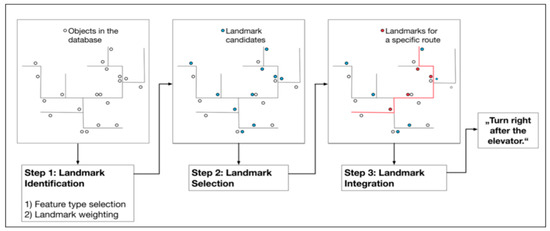 - Fellner, I.; Huang, H.; Gartner, G. “Turn Left after the WC, and Use the Lift to Go to the 2nd Floor”—Generation of Landmark-Based Route Instructions for Indoor Navigation. ISPRS Int. J. Geo-Inf. 2017, 6, 183. [Google Scholar] [CrossRef]